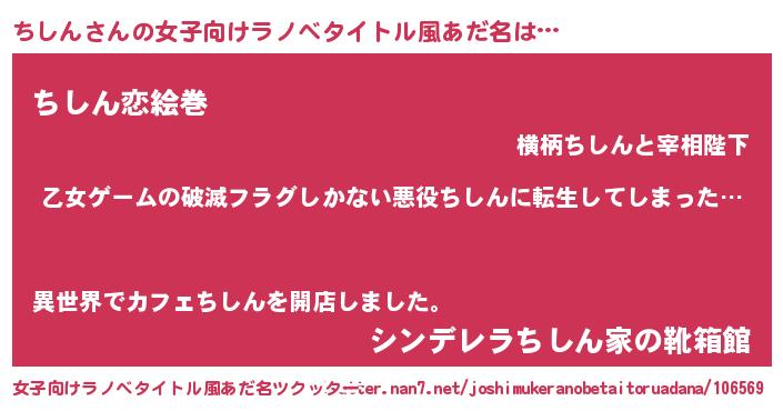 | 男性向けラノベタイトル風あだ名 | 『この素晴らしい世界にちしんを!』 |