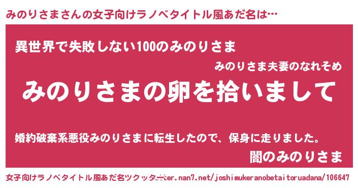 | 男性向けラノベタイトル風あだ名 | 『みのりさまの嫁は女の子じゃないと思った?』 |
