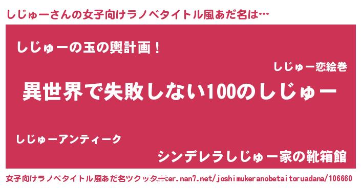 | 男性向けラノベタイトル風あだ名 | 『しじゅーという概念が存在しない退屈な世界 』 |