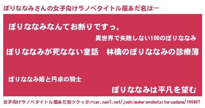 | 男性向けラノベタイトル風あだ名 | 『魔弾の王とぽりななみ』 |