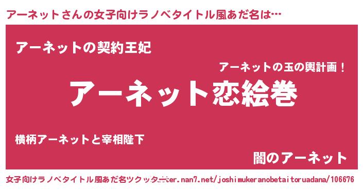 | 男性向けラノベタイトル風あだ名 | 『おまえをオタクにしてやるから、俺をアーネットにしてくれ! 』 |