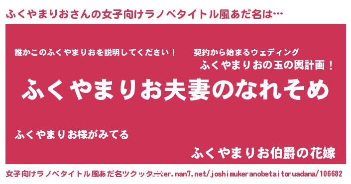 ふくやまりおさんの女子向けラノベタイトル風あだ名は… 『ふくやまりお夫妻のなれそめ』『誰かこのふくやまりおを説明してください! ~契約から始まるウェディング~』『ふくやまりお伯爵の花嫁』 ツクッター #女子向けラノベタイトル風あだ名ツクッター http://tkutter.nan7.net/joshimukeranobetaitoruadana/106682/