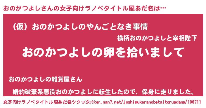 | 男性向けラノベタイトル風あだ名 | 『おのかつよしの嫁は女の子じゃないと思った?』 |