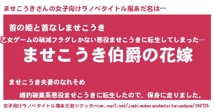 | 男性向けラノベタイトル風あだ名 | 『うちの娘の為ならば、俺はもしかしたらませこうきも倒せるかもしれない。』 |