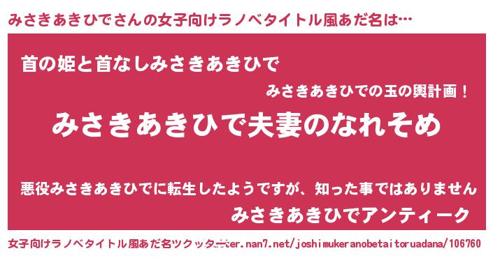 | 男性向けラノベタイトル風あだ名 | 『おまえをオタクにしてやるから、俺をみさきあきひでにしてくれ! 』 |