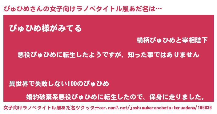 | 男性向けラノベタイトル風あだ名 | 『この素晴らしい世界にぴゅひめを!』 |