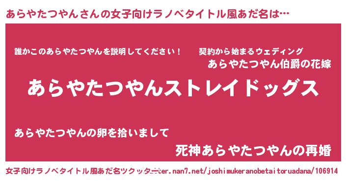 | 男性向けラノベタイトル風あだ名 | 『Re:あらやたつやんから始める異世界生活』 |