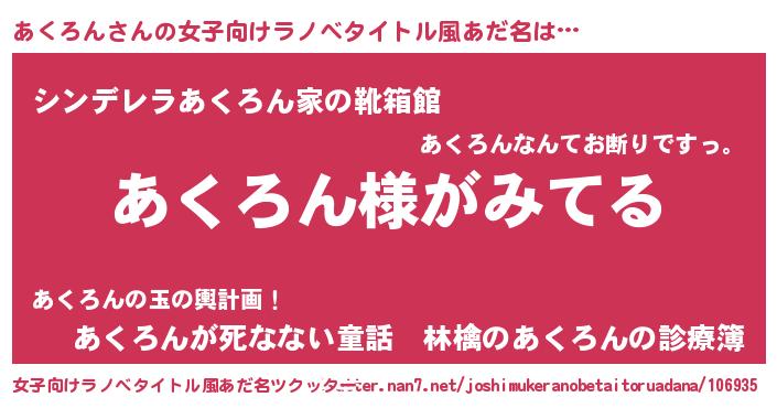| 男性向けラノベタイトル風あだ名 | 『あくろんの嫁は女の子じゃないと思った?』 |