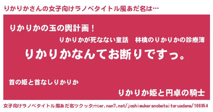 りかりかさんの女子向けラノベタイトル風あだ名は… 『りかりかなんてお断りですっ。』『りかりかの玉の輿計画!』『りかりか姫と円卓の騎士』 ツクッター #女子向けラノベタイトル風あだ名ツクッター http://tkutter.nan7.net/joshimukeranobetaitoruadana/106954/
