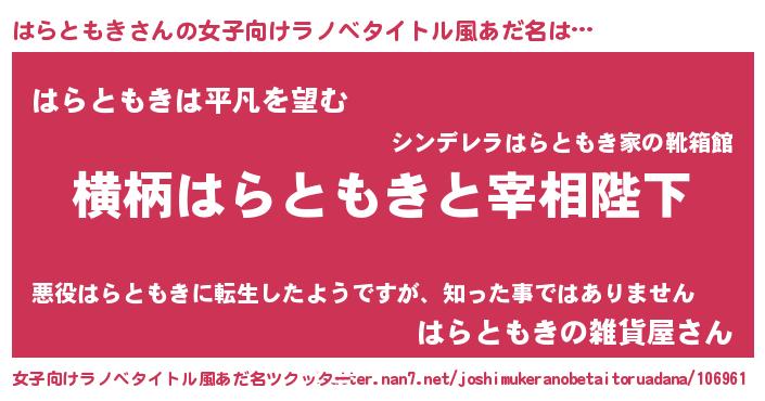 はらともきさんの女子向けラノベタイトル風あだ名は… 『横柄はらともきと宰相陛下』『はらともきは平凡を望む』『はらともきの雑貨屋さん』 ツクッター #女子向けラノベタイトル風あだ名ツクッター http://tkutter.nan7.net/joshimukeranobetaitoruadana/106961/