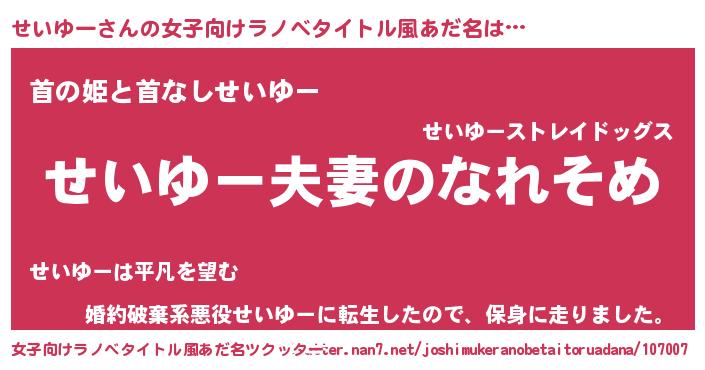 | 男性向けラノベタイトル風あだ名 | 『おまえをオタクにしてやるから、俺をせいゆーにしてくれ! 』 |