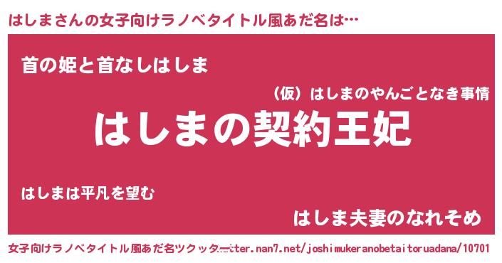 | 男性向けラノベタイトル風あだ名 | 『誰もが恐れるあのはしまが、ぼくの専属メイドになるようです。』 |