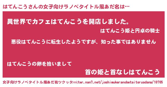 | 男性向けラノベタイトル風あだ名 | 『この素晴らしい世界にはてんこうを!』 |