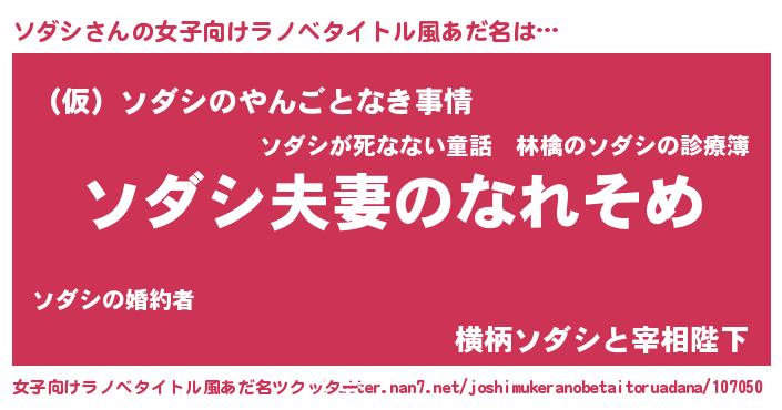 | 男性向けラノベタイトル風あだ名 | 『おまえをオタクにしてやるから、俺をソダシにしてくれ! 』 |