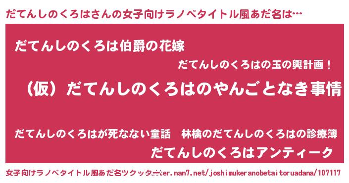 だてんしのくろはさんの女子向けラノベタイトル風あだ名は… 『(仮)だてんしのくろはのやんごとなき事情』『だてんしのくろは伯爵の花嫁』『だてんしのくろはアンティーク』 ツクッター #女子向けラノベタイトル風あだ名ツクッター http://tkutter.nan7.net/joshimukeranobetaitoruadana/107117/