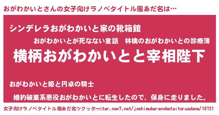 | 男性向けラノベタイトル風あだ名 | 『おがわかいとに滅ぼされるだけの簡単なお仕事です』 |