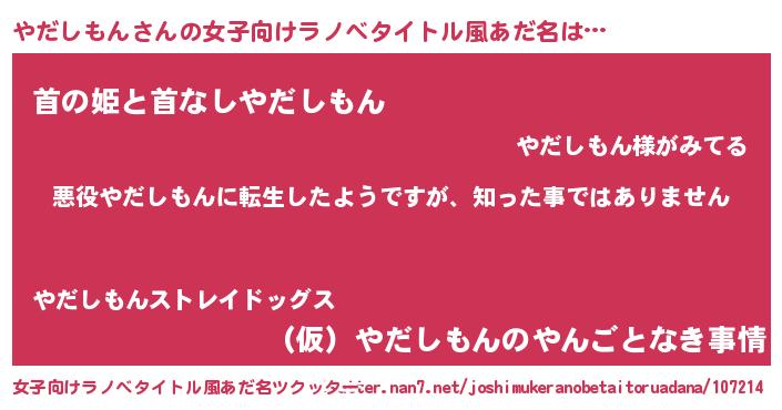 | 男性向けラノベタイトル風あだ名 | 『この素晴らしい世界にやだしもんを!』 |