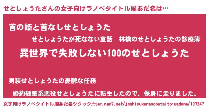 | 男性向けラノベタイトル風あだ名 | 『せとしょうたという概念が存在しない退屈な世界 』 |