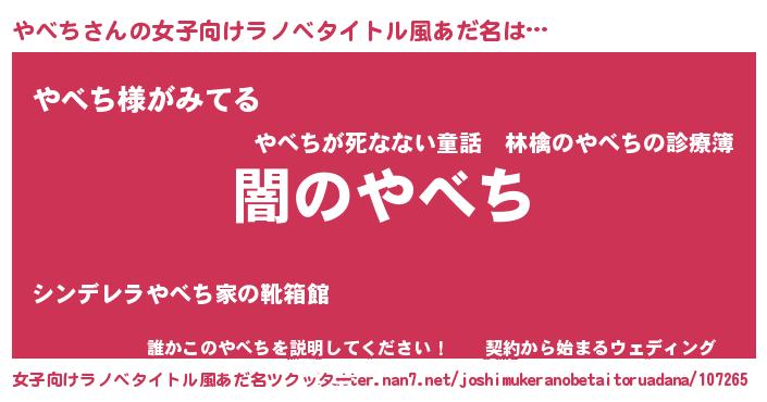 | 男性向けラノベタイトル風あだ名 | 『Re:やべちから始める異世界生活』 |