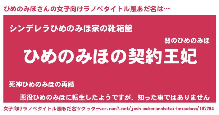 ひめのみほさんの女子向けラノベタイトル風あだ名は… 『ひめのみほの契約王妃』『シンデレラひめのみほ家の靴箱館』『悪役ひめのみほに転生したようですが、知った事ではありません』 ツクッター #女子向けラノベタイトル風あだ名ツクッター http://tkutter.nan7.net/joshimukeranobetaitoruadana/107294/