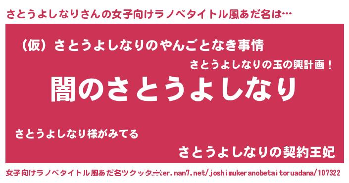 さとうよしなりさんの女子向けラノベタイトル風あだ名は… 『闇のさとうよしなり』『(仮)さとうよしなりのやんごとなき事情』『さとうよしなりの契約王妃』 ツクッター #女子向けラノベタイトル風あだ名ツクッター http://tkutter.nan7.net/joshimukeranobetaitoruadana/107322/