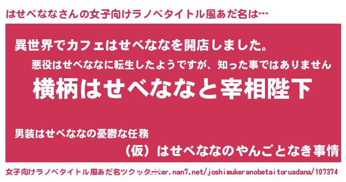 | 男性向けラノベタイトル風あだ名 | 『はせべななに滅ぼされるだけの簡単なお仕事です』 |