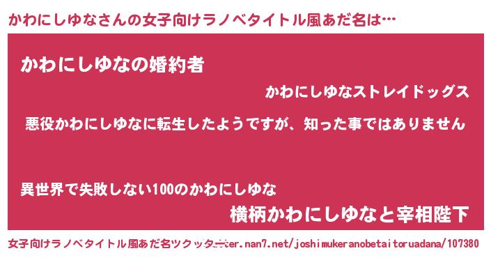 | 男性向けラノベタイトル風あだ名 | 『この素晴らしい世界にかわにしゆなを!』 |