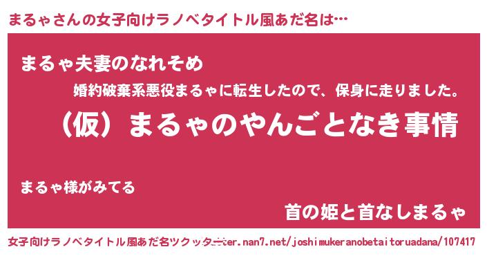 まるゃさんの女子向けラノベタイトル風あだ名は… 『(仮)まるゃのやんごとなき事情』『まるゃ夫妻のなれそめ』『首の姫と首なしまるゃ』 ツクッター #女子向けラノベタイトル風あだ名ツクッター http://tkutter.nan7.net/joshimukeranobetaitoruadana/107417/