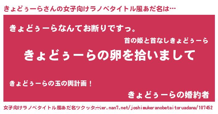 | 男性向けラノベタイトル風あだ名 | 『きょどぅーらの嫁は女の子じゃないと思った?』 |