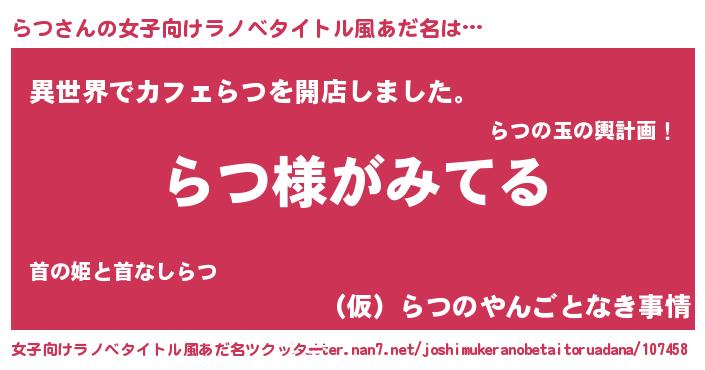 らつさんの女子向けラノベタイトル風あだ名は… 『らつ様がみてる』『異世界でカフェらつを開店しました。』『(仮)らつのやんごとなき事情』 ツクッター #女子向けラノベタイトル風あだ名ツクッター http://tkutter.nan7.net/joshimukeranobetaitoruadana/107458/
