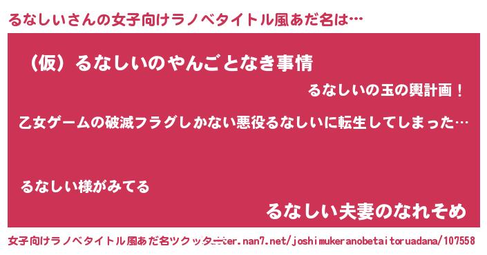 | 男性向けラノベタイトル風あだ名 | 『この素晴らしい世界にるなしいを!』 |