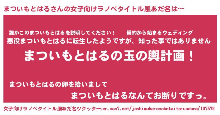 | 男性向けラノベタイトル風あだ名 | 『まついもとはる~年齢イコール彼女いない歴の魔法使い~』 |