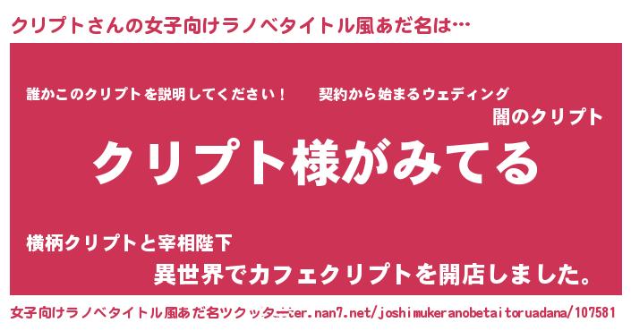 | 男性向けラノベタイトル風あだ名 | 『クリプトの嫁は女の子じゃないと思った?』 |