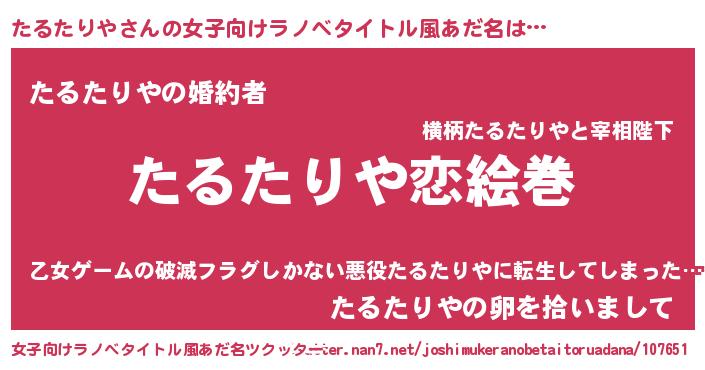| 男性向けラノベタイトル風あだ名 | 『おまえをオタクにしてやるから、俺をたるたりやにしてくれ! 』 |