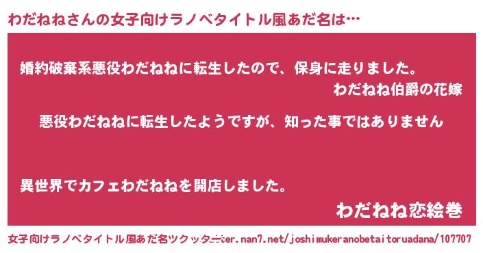 | 男性向けラノベタイトル風あだ名 | 『この素晴らしい世界にわだねねを!』 |