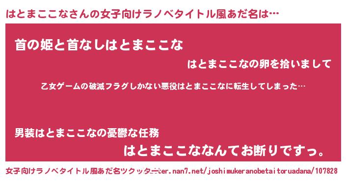 | 男性向けラノベタイトル風あだ名 | 『魔弾の王とはとまここな』 |