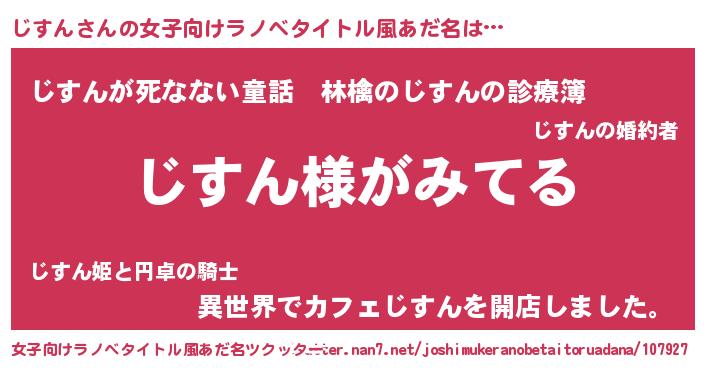 | 男性向けラノベタイトル風あだ名 | 『じすんの嫁は女の子じゃないと思った?』 |
