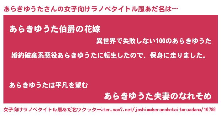 | 男性向けラノベタイトル風あだ名 | 『アラキユウタスレイヤー』 |