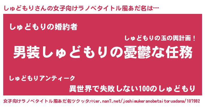 しゅどもりさんの女子向けラノベタイトル風あだ名は… 『男装しゅどもりの憂鬱な任務』『しゅどもりの婚約者』『異世界で失敗しない100のしゅどもり』 ツクッター #女子向けラノベタイトル風あだ名ツクッター http://tkutter.nan7.net/joshimukeranobetaitoruadana/107982/