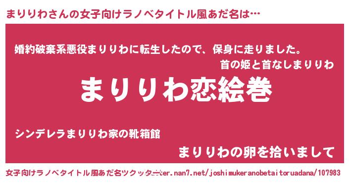 | 男性向けラノベタイトル風あだ名 | 『おまえをオタクにしてやるから、俺をまりりわにしてくれ! 』 |