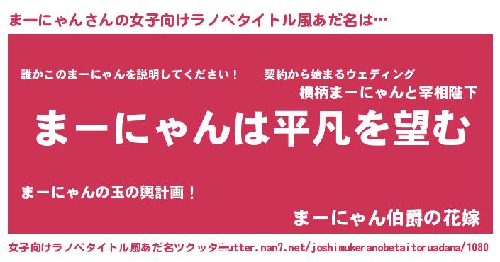 | 胡散臭い通販商品みたいなあだ名 | 『信頼と実績のサプリメント…その名も「まーにゃん」』 |