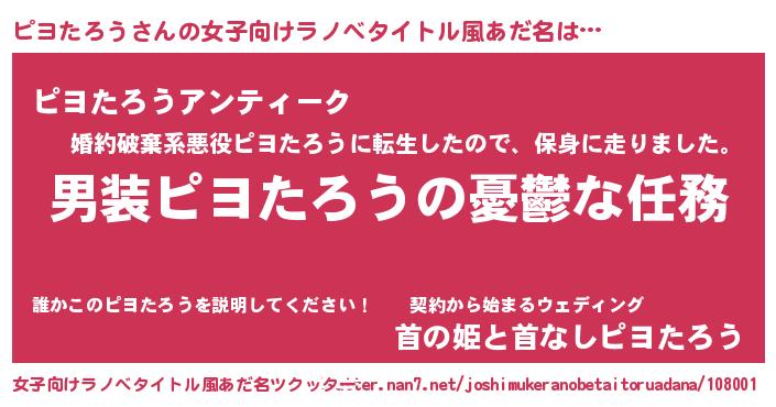 | 胡散臭い通販商品みたいなあだ名 | 『芸能人もオススメする高麗人参…その名も「ピヨたろう」』 |