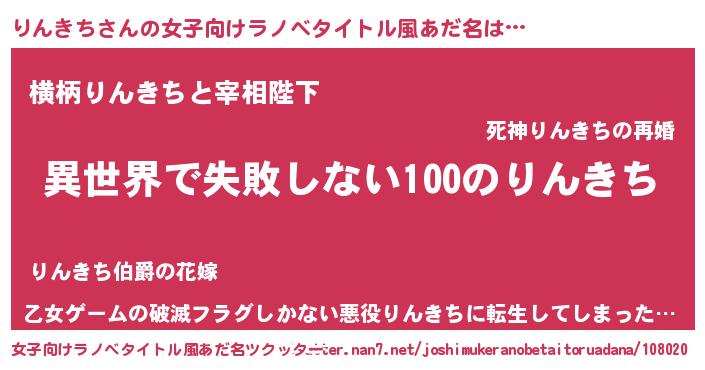 | 男性向けラノベタイトル風あだ名 | 『りんきちという概念が存在しない退屈な世界 』 |