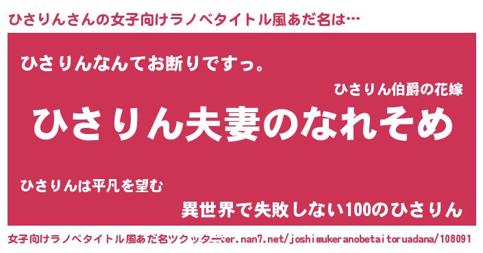 | 男性向けラノベタイトル風あだ名 | 『おまえをオタクにしてやるから、俺をひさりんにしてくれ! 』 |
