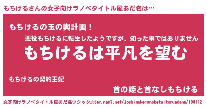 もちけるさんの女子向けラノベタイトル風あだ名は… 『もちけるは平凡を望む』『もちけるの玉の輿計画!』『首の姫と首なしもちける』 ツクッター #女子向けラノベタイトル風あだ名ツクッター http://tkutter.nan7.net/joshimukeranobetaitoruadana/108112/