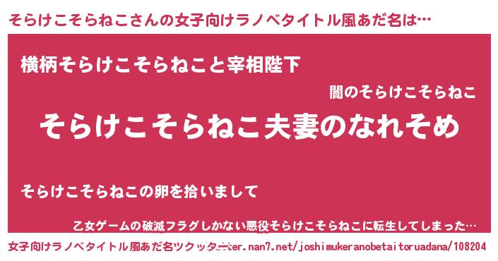 | 男性向けラノベタイトル風あだ名 | 『おまえをオタクにしてやるから、俺をそらけこそらねこにしてくれ! 』 |