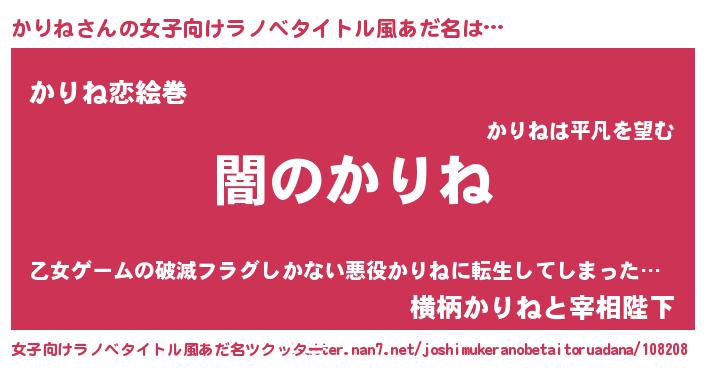 かりねさんの女子向けラノベタイトル風あだ名は… 『闇のかりね』『かりね恋絵巻』『横柄かりねと宰相陛下』 ツクッター #女子向けラノベタイトル風あだ名ツクッター http://tkutter.nan7.net/joshimukeranobetaitoruadana/108208/