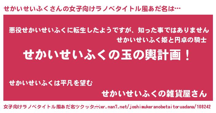 | 胡散臭い通販商品みたいなあだ名 | 『あなたにだけ特別に提供する100年もののヴィンテージワイン…その名も「せかいせいふく」』 |