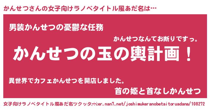 | 男性向けラノベタイトル風あだ名 | 『かんせつ~年齢イコール彼女いない歴の魔法使い~』 |