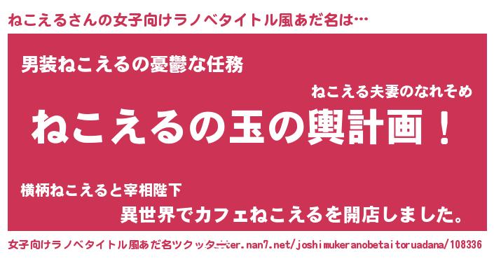 男性向けラノベタイトル風あだ名 | 『ねこえる~年齢イコール彼女いない歴の魔法使い~』 |